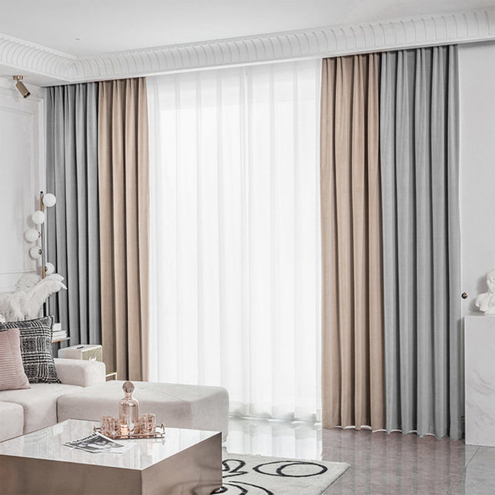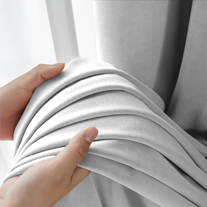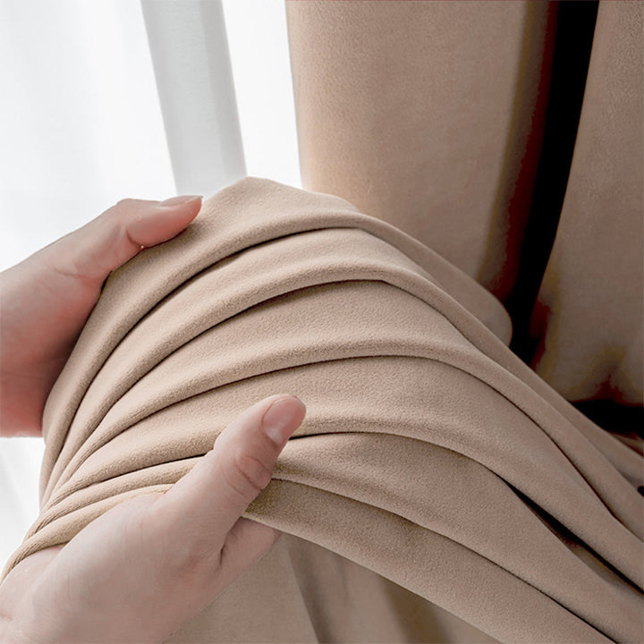 Duo-Samtvorhänge mit weicher, fließender Textur sind angenehm anzufassen, bilden keine Falten, blockieren bis zu 80 % des Sonnenlichts und bieten thermische Isolierung – sowohl gegen Kälte im Winter als auch gegen Hitze im Sommer.