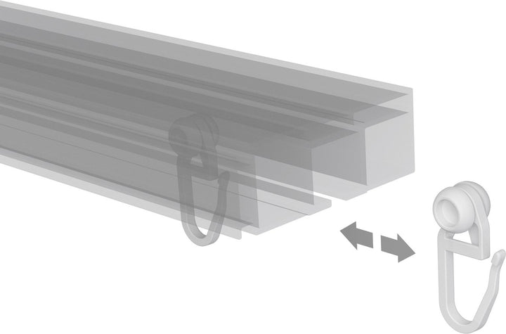 Diese Innenlaufrollen mit Faltenlegehaken verwendet man dazu, um die Vorhänge und Gardinen an den Gardinenschienen zu befestigen. Hierzu schiebt man die kleinen Gardinenrollen in das Profil der Vorhangschiene ein. Schnell bemerkt man, dass sich diese Innenlaufrollen sehr leichtgängig und leise bewegen lassen. Dieser Vorteil ist auch übertragbar auf das Verschieben der daran angebrachten Vorhänge oder Gardinen. Der Faltenlegehaken der Innenlaufrolle hat ein verschließbares Häkchen, in welches das Gardinenband (Kräuselband) der Gardine eingelegt werden kann.